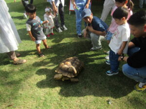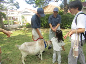 今回のイベントでは、鳥類やハムスターなどの小動物の展示、モルモットやマウスのふれあいだけでなく、ケヅメリクガメやヤギといった動物のふれあいも行いました。