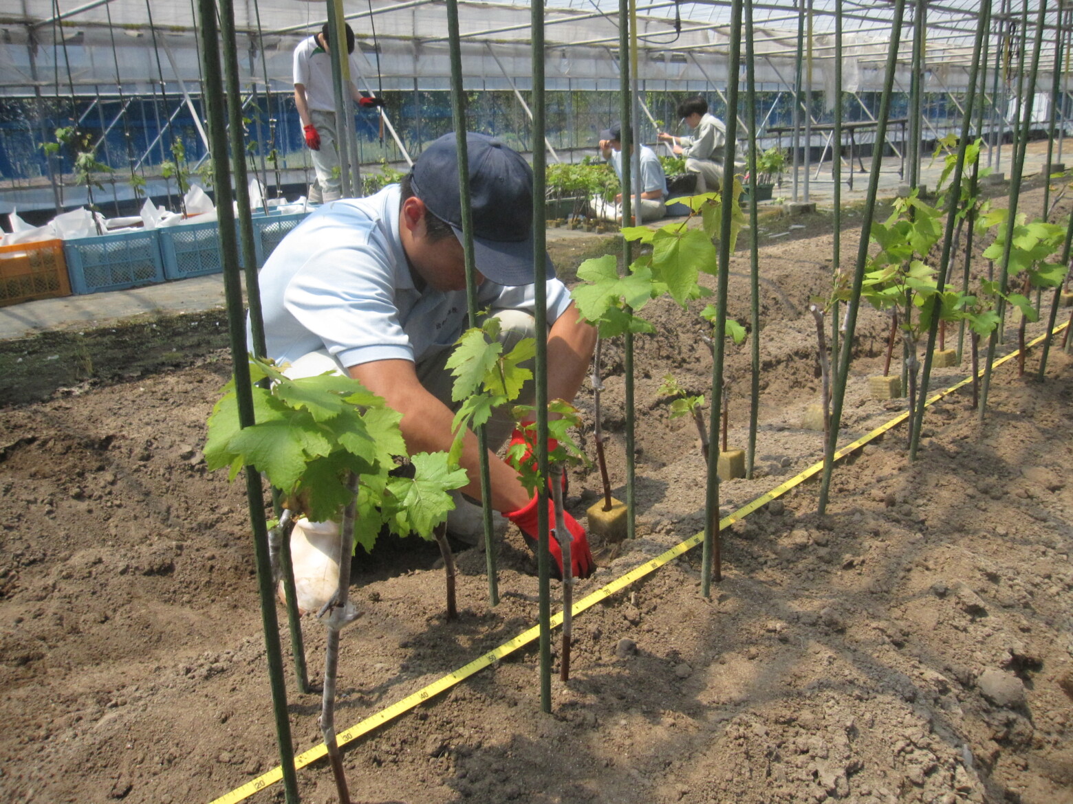 【植物科学科】果樹 苗木の定植を行いました果樹専攻生です! 3月に接木を行った苗木が順調に育ち、先日無事に定植することができました。害虫が葉っぱを食害するので、気をつけなくてはいけません!他の果樹の管理も行いながらなので管理が大変ですが、がんばるぞ! ※本校では平成28年から学習の一環として、JAしまね出雲ぶどう部会様、JAしまね出雲地区本部様と連携しながら優良ぶどう品種の苗木生産に取り組んでいます。