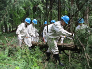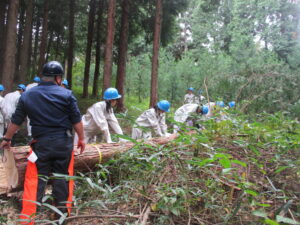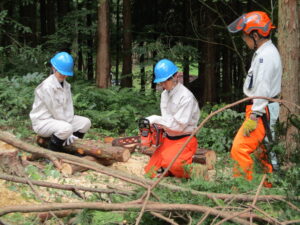 NPO法人もりふれ倶楽部さまご協力のもと、飯南町来島にてチェーンソーの扱い方や倒木を体験しました。