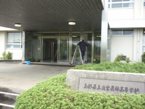 10月6日、昨年度に引き続き島根県ビルメンテナンス協同組合の組合員様3名にお越しいただき、正面玄関のガラスを清掃していただきました。