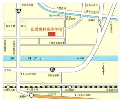 アクセスマップ 島根県立出雲農林高等学校 所在地 〒693-0046 島根県出雲市下横町950 電話番号 (0853)28-0321 ファックス番号 (0853)28-0355 E-mailアドレス 島根県立出雲農林高等学校 付近図 マップ表示