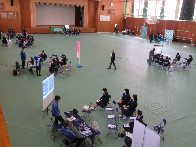 【進路指導部】地元企業ガイダンスを実施しました3月12日(水)2~4限に、地元の企業様34社をお招きして地元企業ガイダンスを行いました。参加した1・2年生はそれぞれが希望する4つの企業の内容や業務、仕事での体験談などを熱心に聞いていました。 近年、就職のほとんどが島根県内で内定をいただいている状況を考えると、今後の進路を決める非常に重要なイベントになったのではないでしょうか。 ご協力いただきました企業の皆様、本当にありがとうございました。