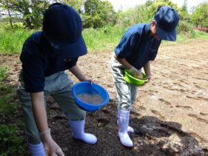 また、24日には「ゴールドラッシュ86」というスイートコーンの種をまきました。株間・条間をそれぞれ測定し、1人30粒播種しました。発芽し、ある程度成長したら日当たりや風通しを良くするために間引きを行います。